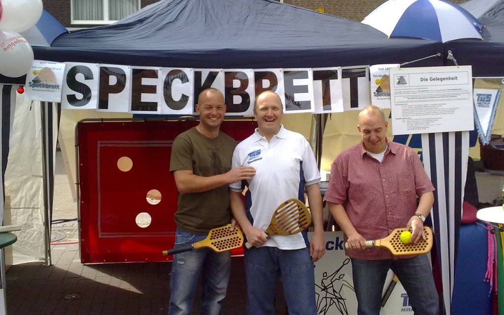 Auf dem Hiltruper Frühlingsfest konnten sich die Besucher auch über den typisch Münsteraner Speckbrettsport informieren. Zu ihrem 30. Geburtstag präsentierte sich die Speckbrettabteilung des TuS Hiltrup mit einem eigenen Stand. Die vielen Interessenten erhielten so von den Mitgliedern viel Wissenswertes über den Speckbrettsport aus erster Hand. Auch wurde eine Saisonmitgliedschaft vorgestellt. Hierbei können Speckbrettspielerinnen und -spieler für einen moderaten Beitrag eine Saison lang täglich die Speckbrettanlage nutzen. Aber es gab nicht nur Informationen. Es konnten auch das außergewöhnliche Sportgerät ausprobiert und an einer Trefferwand Punkte gesammelt werden. Gute Trefferergebnisse wurden mit kleinen Sachpreisen belohnt.
