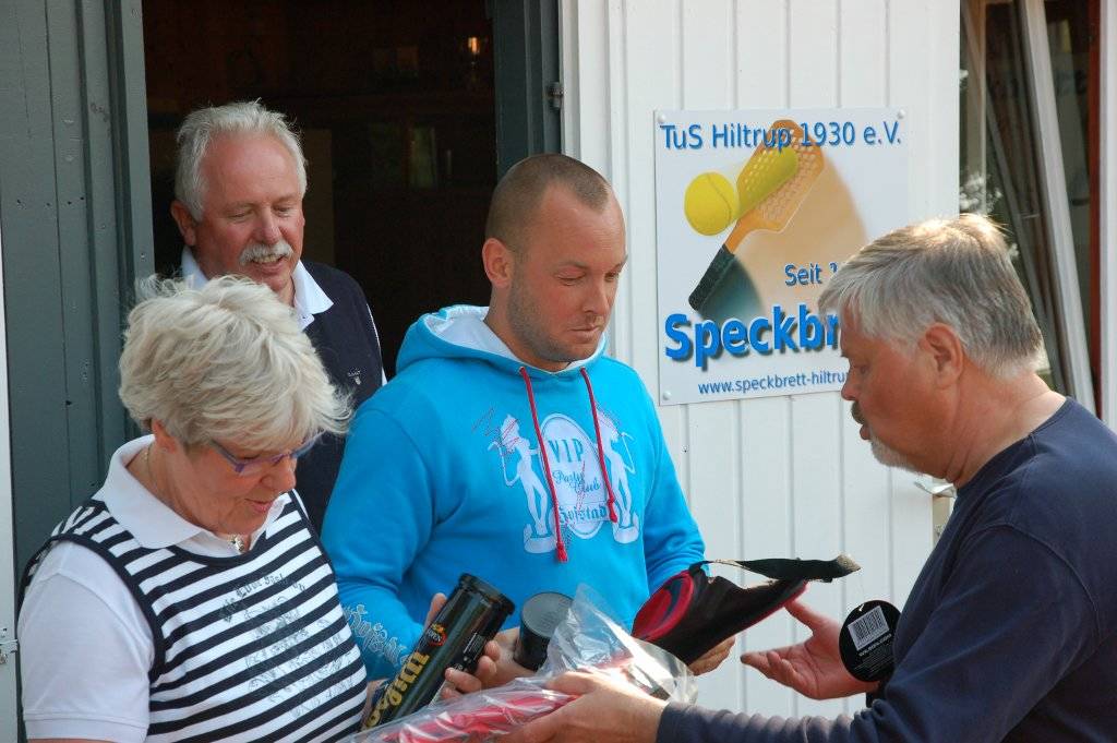 Die guten Wetterbedingungen waren der Grund für die hohe Teilnehmerzahl an dem Turnier, das am Samstag von der Abteilung Speckbrett des TuS Hiltrup zur Saisoneröffnung ausgetragen wurde. Erst nach über fünf Stunden sportlichem Wettkamp standen die Endspielteilnehmer fest. Annette Pattmöller gelang es, mit allen gewonnen Spielen ins Endspiel einzuziehen. Sie blieb ihrer erfolgreichen Linie an diesem Tag treu und gewann zusammen mit Daniel Weste auch das Endspiel gegen Daniel Kentrup und Wilfried Damerow. Die zahlreichen Besucher und Akteure bekamen an diesem Tag guten Speckbrettsport geboten. Die Sieger des Turniers und die Zweiplatzierten wurden mit viel Beifall und mit kleinen Sachpreisen belohnt. Anschließend wurde beim geselligen Ausklang auf den 1. Mai gewartet.