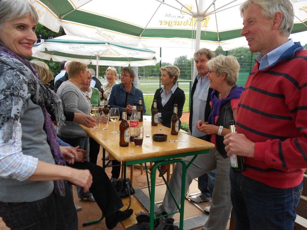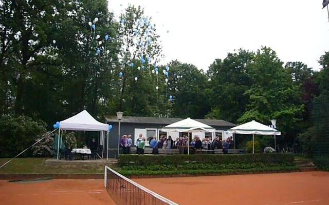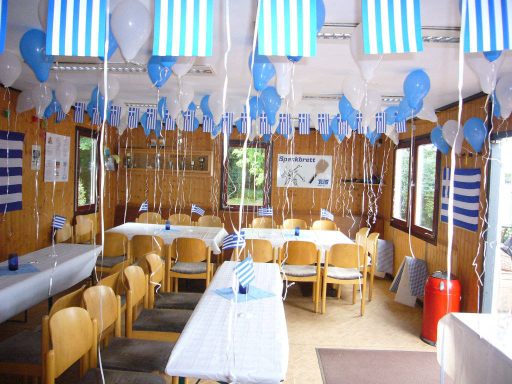 Das Sommerfest am 28.Mai stand ganz unter einem griechischen Motto. Hierfür hatten sich die Organisatoren etwas Besonderes einfallen lassen. Das Blockhaus und die Terrasse waren in den griechischen Landesfarben geschmückt. Die Tischdekoration bis hin zu den Servietten und die mit Gas gefüllten Luftballons, die die Decke zierten, alles war in blau-weiß gehalten. Vor allem aber die griechischen Flaggen und Wimpel gaben das richtige Flair. Großes Lob erntete Karl-Heinz Beyer, der diese Dekoration organisiert hatte. Zu griechischen Klängen wurde das griechische Büfett serviert.