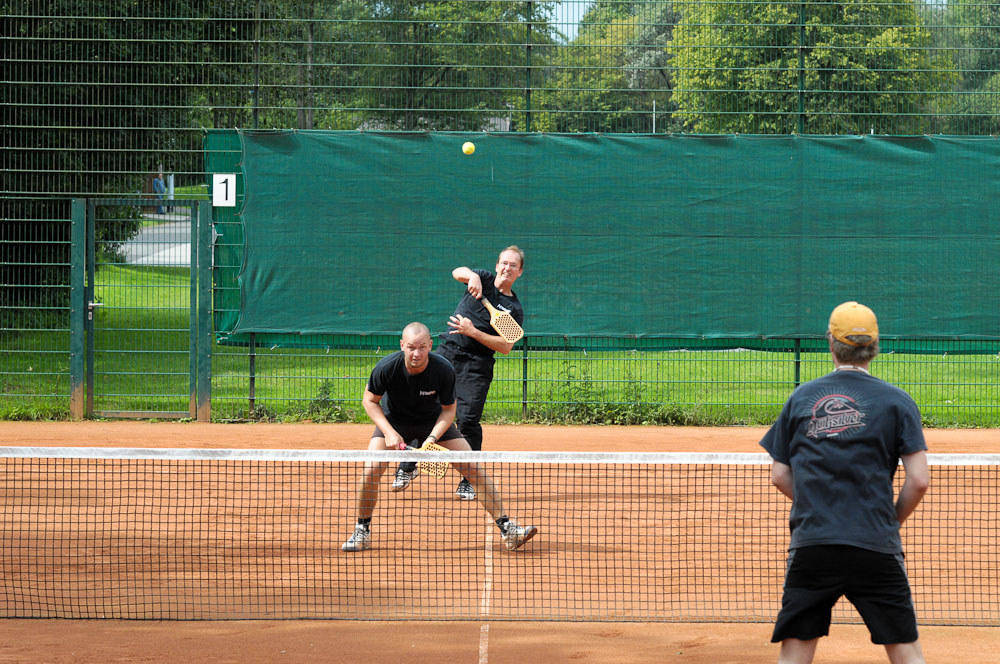 Was sie im nächsten Jahr eine Liga höher erwartet, davon konnten sie sich am Sonntag überzeugen, denn parallel zu den Restspielen der offenen Klasse suchten die Akteure der Sonderklasse ihre Finalisten. Auch hier kamen mit Christoph Hagedorn/Michael Thiemann (vereinslos/SV 91) die Favoriten ungeschlagen durch. Sie besiegten im letzten Spiel nach dramatischer Schlussphase mit fünf zum Teil mit Hilfe der Netzkante abgewehrten Matchbällen die an zwei gesetzten Jan Borkenhagen/Jochen Zeidler (vereinslos/SV 91) mit 25:23 im Entscheidungssatz und haben nun die Chance, ihren Titel von 2010 zu wiederholen. Das zu verhindern versuchen am Finaltag Timo Höppner/Dirk Nordhaus (SVSH/SV 91). An vier gesetzt unterlagen sie in der Hauptrunde bereits ihren Endspielgegnern in zwei Sätzen, lösten das Finalticket dann durch Siege gegen die zuletzt dreimaligen Dritten Winfried Mangels/Daniel Weste (TuS Hiltrup), sowie im letzten Spiel des Tages gegen Borkenhagen/Zeidler, die damit den Bronzerang belegen. Hinter Mangels/Weste (4.) kamen mit Michael Lohrmann/Kay Völler (SV 91/SVSH) und Stefan Tiesmeyer/Christian Vehoff (aus der Ostbad-Fraktion) zwei Aufsteigerpaare vom Vorjahr mit jeweils zwei gewonnenen Matches auf den fünften Rang.