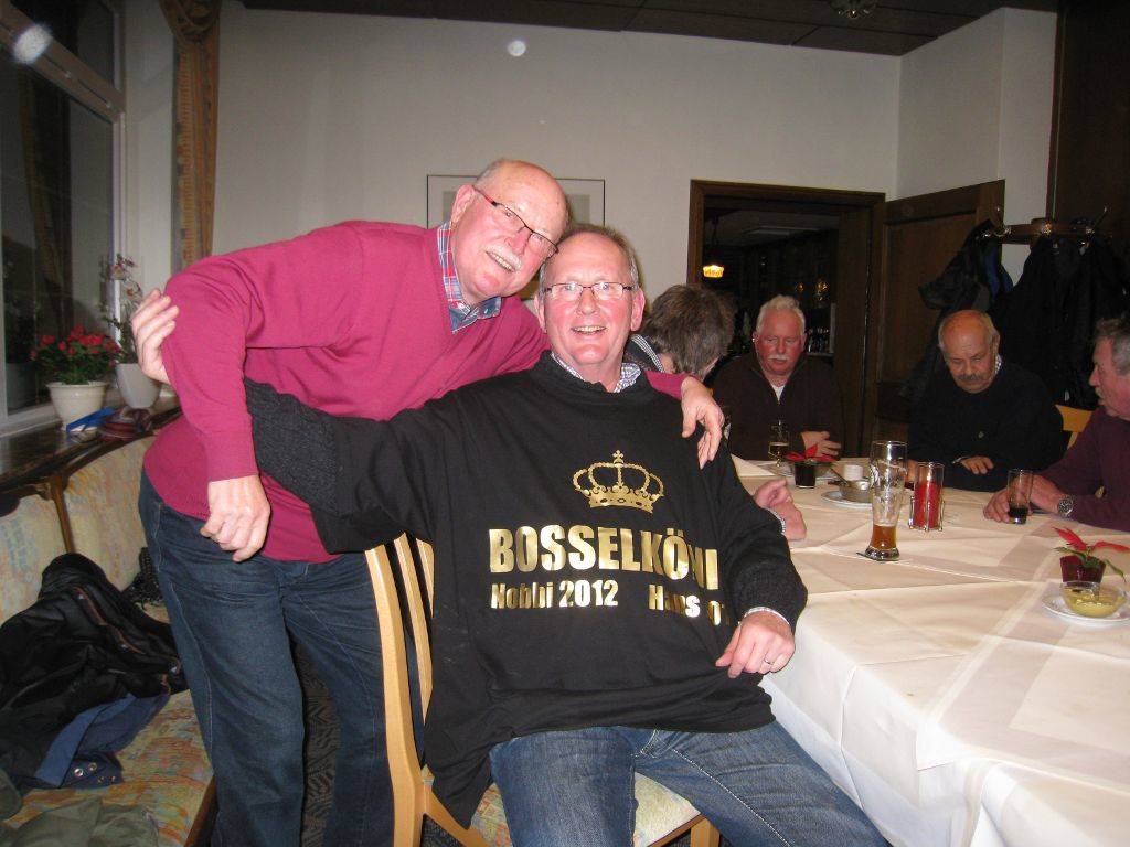 Gerd Riediger, der Bosselkönig 2014, nimmt die Glückwünsche von Siggi Stoll entgegen.