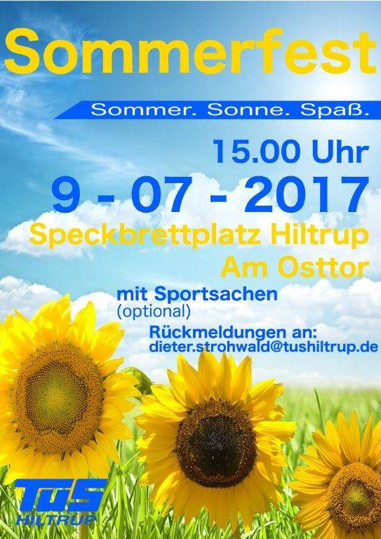 Hallo, wir feiern wieder ein Sommerfest.. Wir haben bestimmt tolles sommerliches Wetter, das ein oder andere Getränk wird nicht fehlen und wer weiß, vielleicht gibt es ja sogar etwas vom Grill.. Also nehmt Euch nichts vor am Sonntag, dem 09.07.17 ab 15 Uhr. Und für die Sportler und Bewegungstalente unter Euch: nehmt Sportsachen mit.., wir spielen ´ne Runde..(Bälle und Schläger sind vor Ort). Zur besseren Planung: bitte Rückmeldung an dieter.strohwald@tushiltrup.de zwecks Teilnahme. Und gaaanz wichtig: bitte an alle Interessierten der Turnabteilung weiterleiten. Danke! |