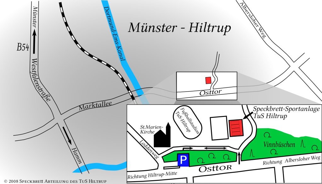 Unsere Speckbrettanlage befindet sich im Süden von Münster, im Stadtteil Hiltrup. Man findet sie ganz leicht mit Hilfe dieser kleine